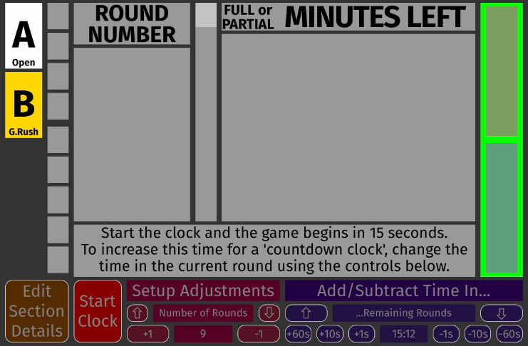 Our brown 'Edit Section Details' button also changed, to a purple 'Edit Round Timing' button. You can go back and forth between the two modes as often as you want. The same is true for the red and green 'Start Clock' / 'Stop Clock' button beside it.