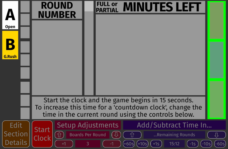 That current round number starts at '-1' and next moves to '0' for the pre-game countdown, then of course goes to round '1'. The green column on the right hand side of the screen shows two rectangles under the green bit, which represent the two boards in a round. We'll want to change that from '2' to '3' under 'Setup Adjustments' as well. |