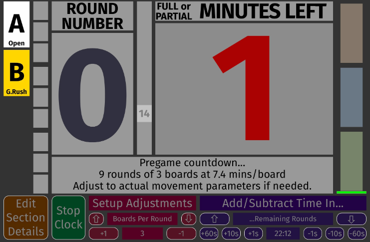 The default setup is Section A (white) as a 13-round open pairs, and Section B (yellow) as a 12-round Gold Rush event, both playing two-board rounds a bit longer than fifteen minutes, with two hospitality breaks of five minutes after round 4 and 9, and a skip in section B after round six. The basic idea is to start the clock very early, possibly even before you start selling, with a 'countdown round' to the scheduled gametime, and make whatever adjustments you need while the clock counts down the minutes to the start. In a club, most of the time you will simply delete Section B and make a few changes to the parameters of Section A and you're good to go. In a tournament, you may want to have several clocks, one for two-board-round games, one for three-board-rounds, and one for four-board-rounds if you have any. You'll have a bit of setting up to do, but it can all be done on the fly easily and checked quickly, while the clock runs. So our first illustration will be to show the way we set things up. We'll assume this is a tournament with multiple events, but lucky for us, all of them are three-board rounds this session. We'll change the number of rounds first to 9, the length of the longest game. The individual sections can be set to go fewer rounds, and end earlier. Let's change the number of rounds to nine, by clicking the '-1' button four times, underneath the label that says 'Number of Rounds.' As you do this, you will see the 13 rounds, represented in the second column from the left, redrawn to 12, then 11, then 10, then 9 rounds... |