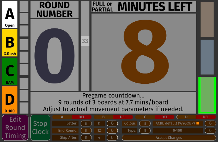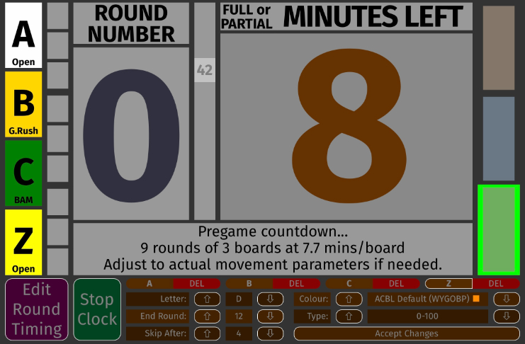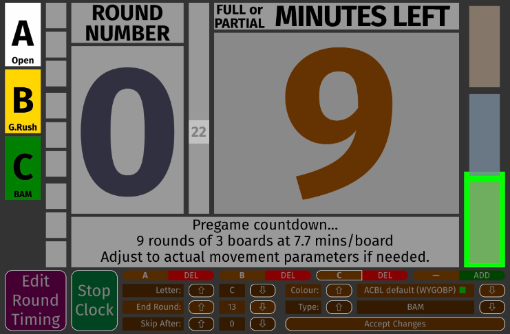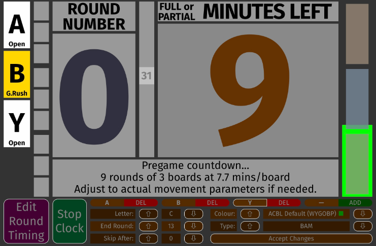 Another interesting effect to take in at this point: that green rectangle on the right is getting smaller as the clock ticks down, and the actual ticking is happening in the middle with a little second blip. But while we looked at all of these effects, our user has been busy at work adding a third section. It looks like Section Y now, but he has changed the letter to 'C', the type to 'BAM,' and nothing has happened. This area is a bit different. To lock in your changes you need to click the 'Accept Changes' button. (This is different from the 'Round Timing' area, where changes made get a screen update immediately.) |