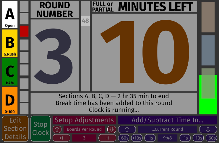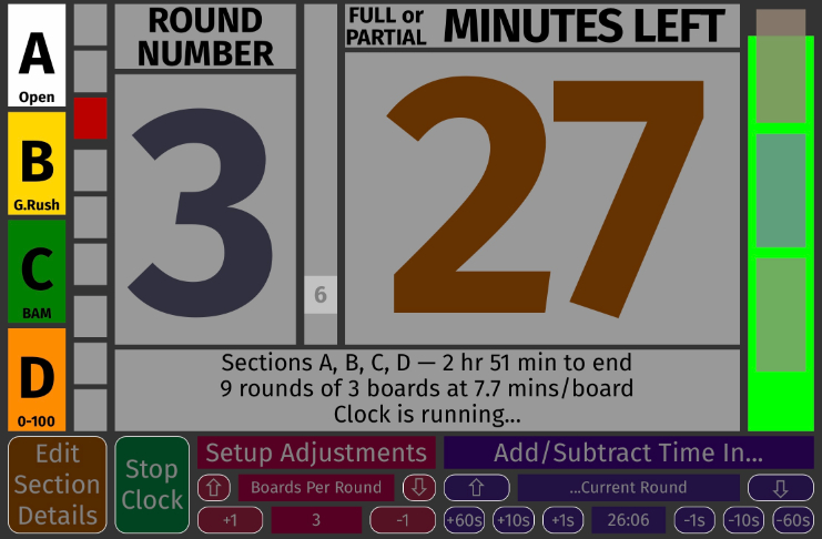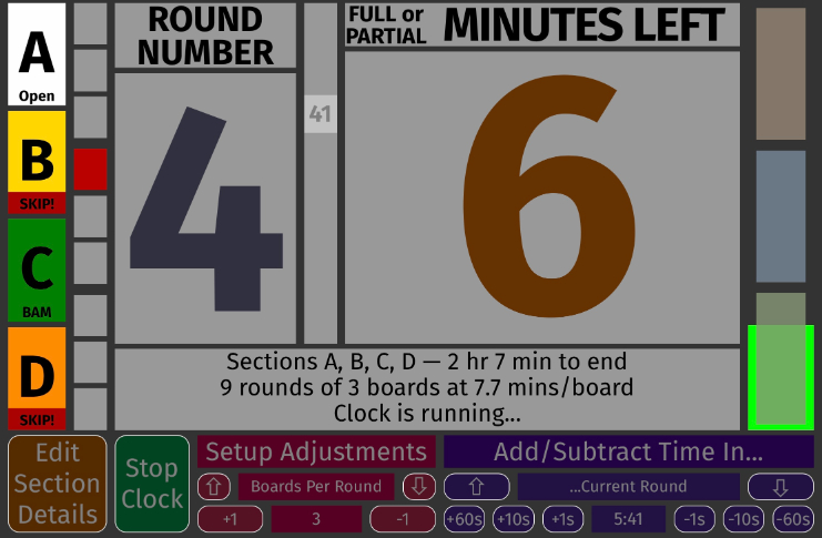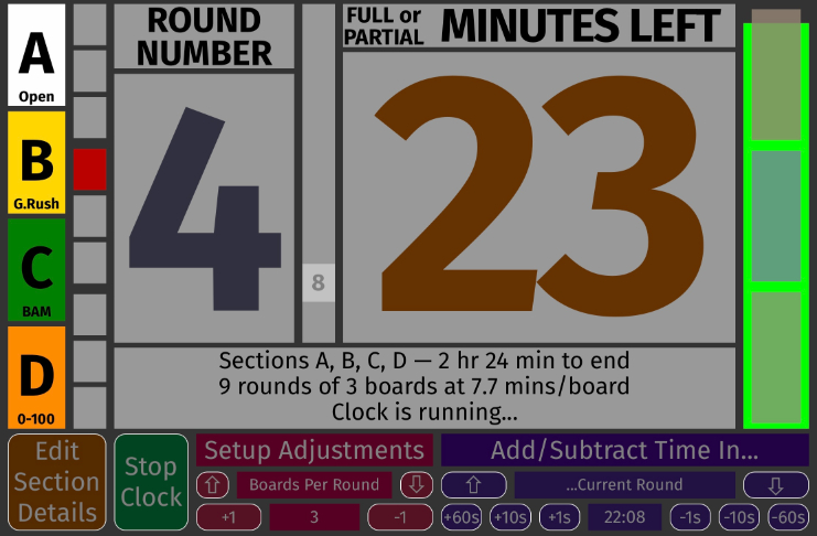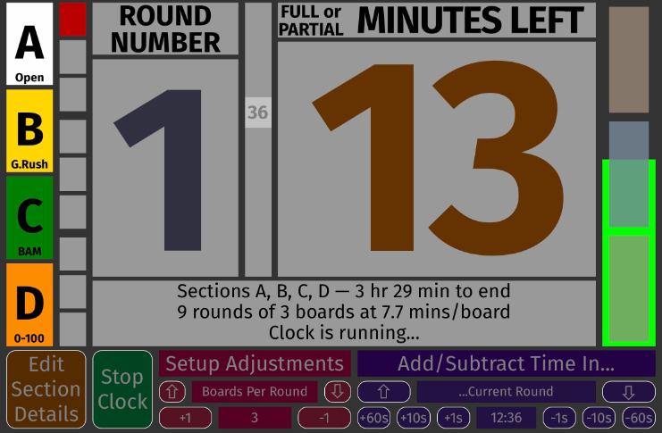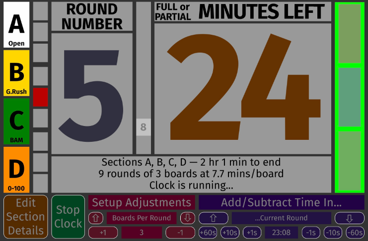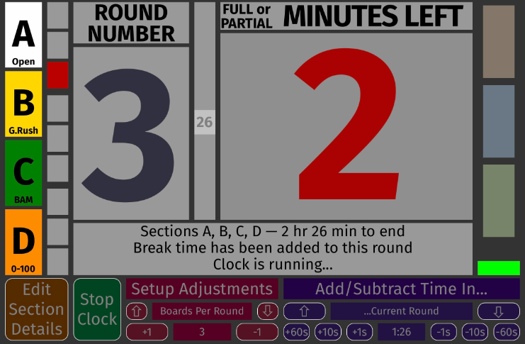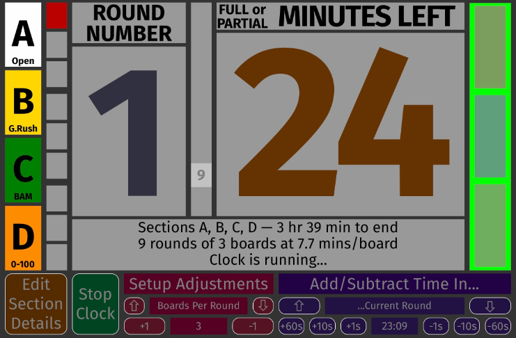 The current round in the second column is in red. This is something you can point to when a somehow-exhausted player asks how many rounds are left in the middle of round two... The first line of the status area below the big numerals now tells us which sections this clock controls and how much time is left until the last game is scheduled to end. The second line tells us how many rounds (maximum, some sections may have less), how many boards per round, and how many minutes players get for each board. If something is set up wrong, this line will reveal what you need to correct. |
