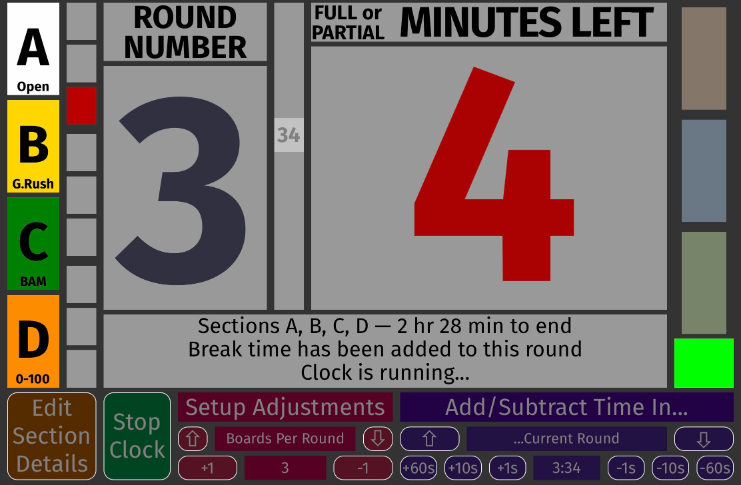 | In every round, when we get to the last four minutes, the number turns bright red. Some Directors like to have a rule that says no new boards may be started at this point, and a red number makes that point emphatically. |