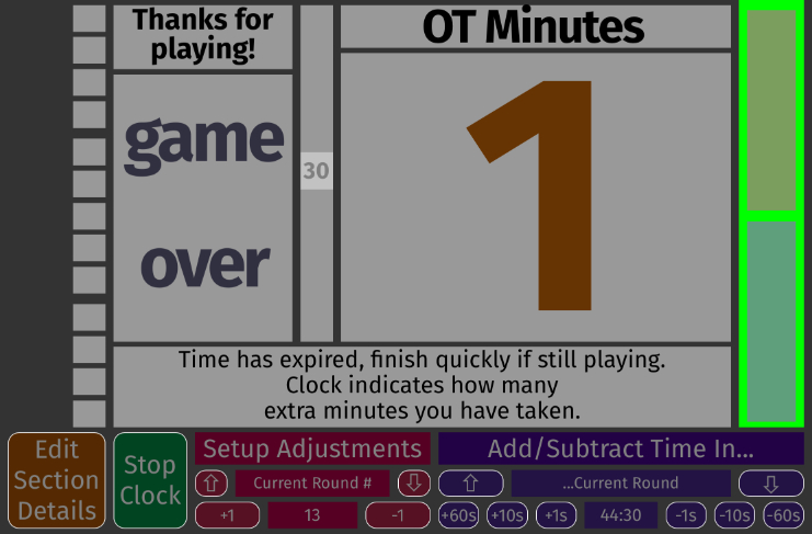 Let's add some time to the clock so we can make the section changes. Scroll through under 'Add/Subtract Time In...' to get to "...Current Round" and then use the '+60' button to add some minutes. |