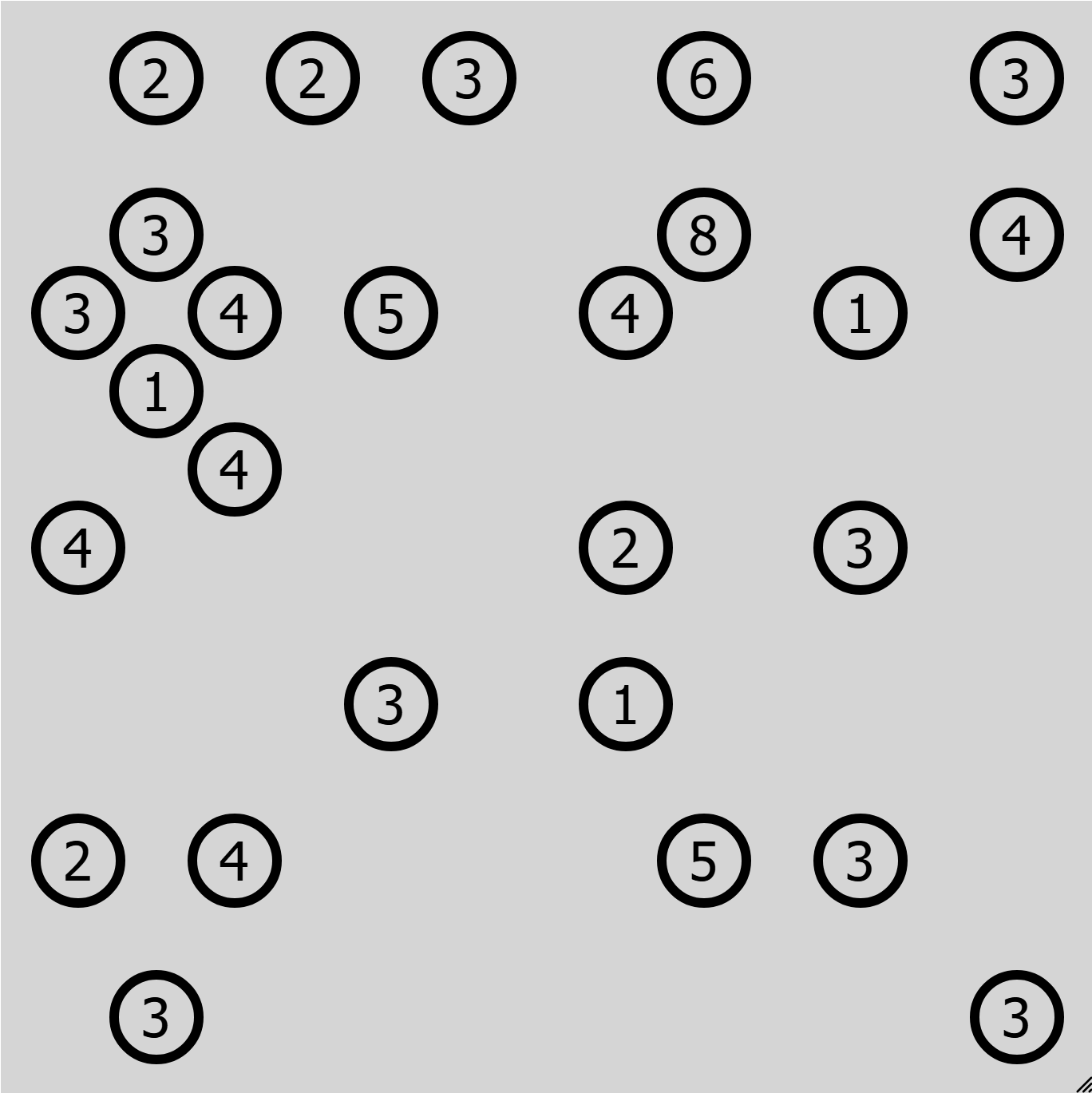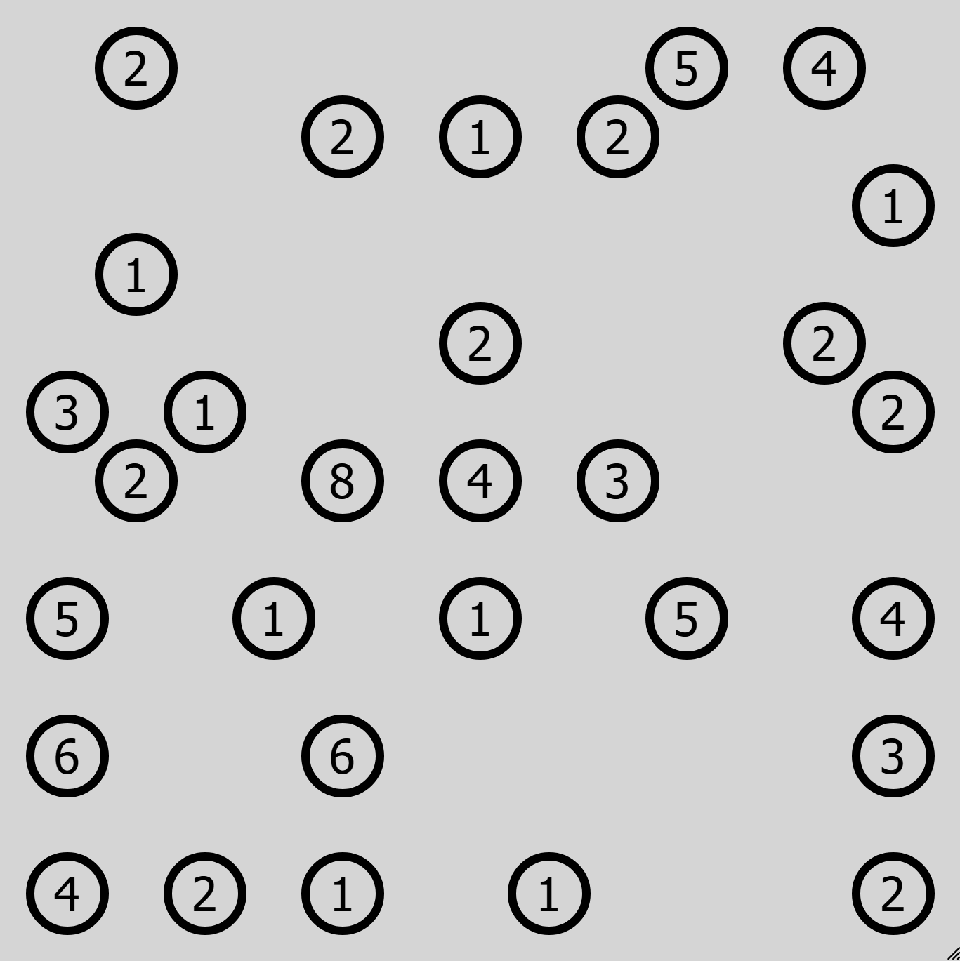 Bridges gives you a grid of islands, circles containing a number. Your objective is connect the islands with bridges so that 1) all bridges are horizontal or vertical only, no diagonal or curved bridges, 2) The numbers in the circles indicate the number of bridges that go to that island, 3) Two islands may be connected with one or two bridges, but no more, 4) Bridges may not cross one another or go over an island, and 5) All of the islands need to be connected together with the network of bridges. Strategy: bigger numbers usually allow you to connect one bridge in each possible direction and later decide which directions have second bridges as well; check how many islands can actually be connected with up-down or left-right lines, often this will give you clues as to where the bridges must be. Click on the puzzle you want to try at the right (or the caption below) to go to the page with all the instructions you’ll need. These puzzles come from Simon Tatham’s Portable Puzzle Collection (see below) and there are links there to apps for most devices.