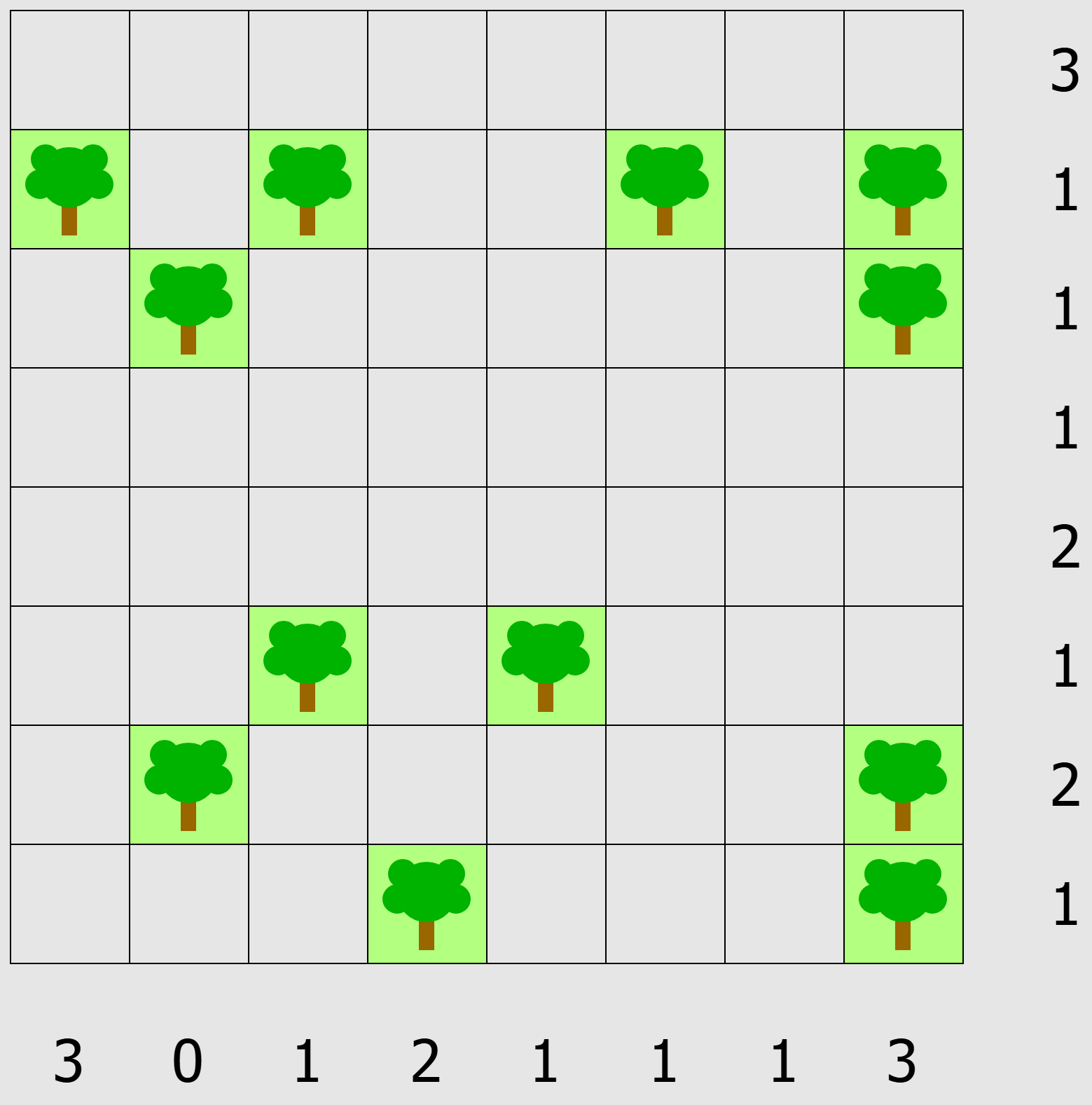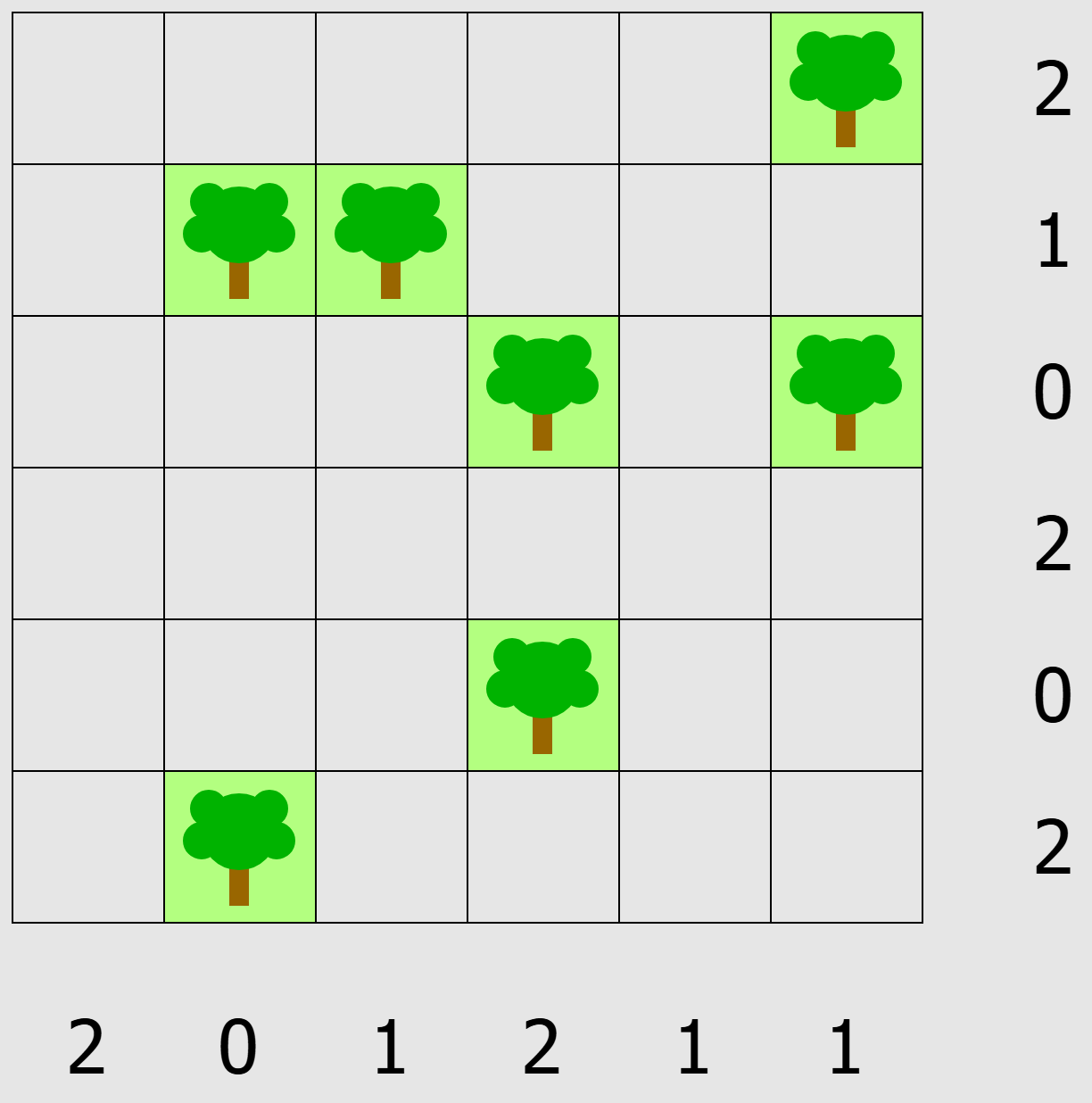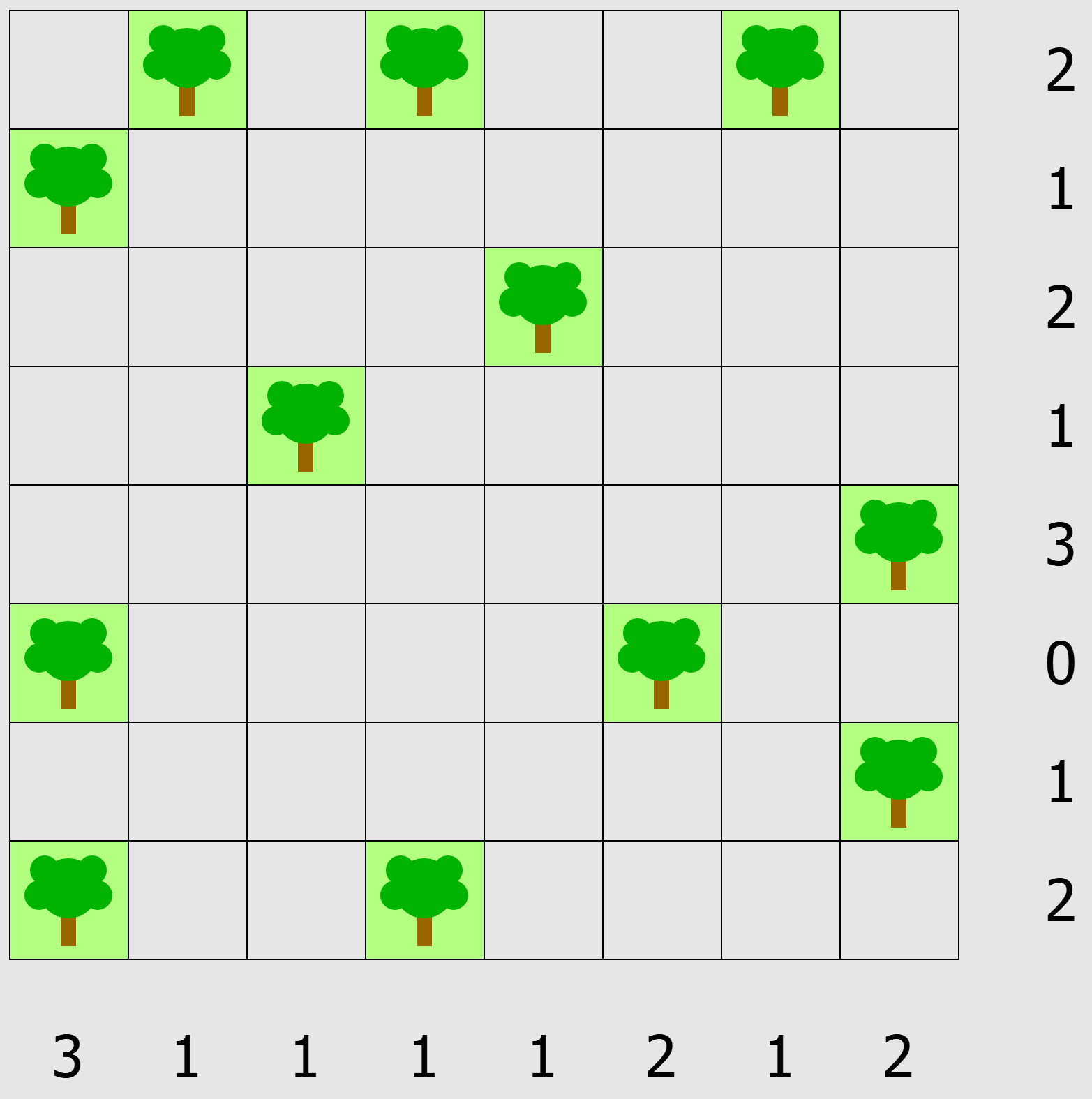 Tents gives you a grid of cells, some of which contain trees. The objective is to place tents in some of the remaining cells, such that 1) there is one tent for each tree that is directly adjacent to it, horizontally or vertically, but not diagonally, 2) no two tents are adjacent (even diagonally), 3) the number of tents in each row and column matches the numbers given to the right and below the grid. Strategy: Find the squares that cannot contain tents at all (too far from trees) and mark them off with an X, then look for rows and columns where the possibilities match the numbers and mark tents in all remaining squares. This will give you more squares adjacent to the tent that can be eliminated, and the answer will slowly appear. Click on the puzzle you want to try at the right (or the caption below) to go to the page with all the instructions you’ll need. These puzzles come from Simon Tatham’s Portable Puzzle Collection (see below) and there are links there to apps for most devices.